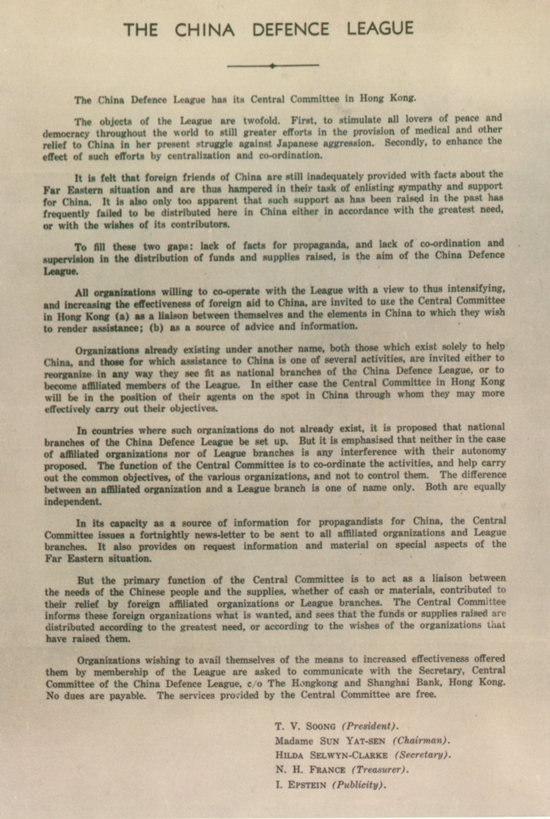 1938年6月14日,宋庆龄和保卫中国同盟中央委员会成员宋子文、克拉克(司徒永觉夫人)、诺曼·法朗士、爱泼斯坦等联合署名发表的《保卫中国同盟成立宣言》