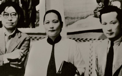 1939年春,宋庆龄在香港参观以抗战为主题的现代漫画展览会预展时,与画家丁聪(左)、陈烟桥(右)合影