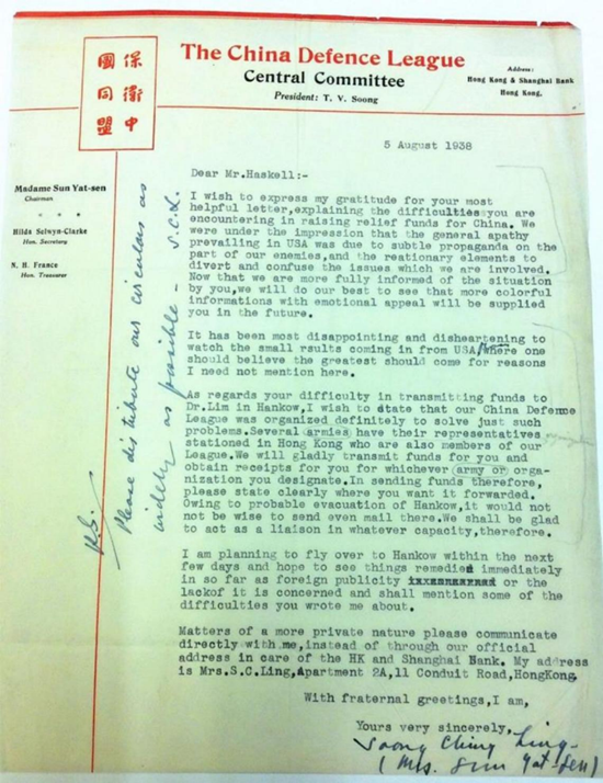 宋庆龄1938年8月5日就医药援华事宜致美国援华会信