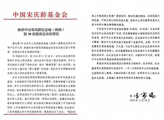 王家瑞在贺信中指出,94年前的今天,即1924年11月28日,孙中山先生偕宋庆龄经日本北上商议国是,他们在神户发表了著名的演讲。孙中山宋庆龄在日本留下革命足迹,结为“精诚笃爱”的人生伴侣,也与日本友人建立起“推心置腹”的友谊。他们为中日两国和世界各国人民之间的友好作出了重要贡献。