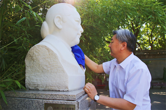李安晋受中国宋庆龄基金会的委托,同时代表宋庆龄故居管理中心向宋庆龄同志汉白玉雕像敬献花篮,仔细整理花篮上的缎带。全体人员向宋庆龄同志雕像三鞠躬,表达深切缅怀和永恒纪念。