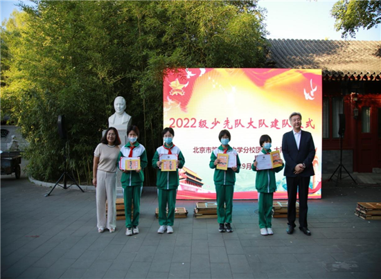 金秋九月,美景怡人。9月20日,北京市第十三中学分校500名初二新生来到宋庆龄故居,在绿竹掩映、古朴肃穆的故居东广场上隆重举行少先队建队仪式,并参加爱国主义教育主题社会大课堂活动。中国宋庆龄基金会副秘书长、宋庆龄故居管理中心主任李安晋出席,与十三分副校长杨晓蓓一起为学生代表颁奖。