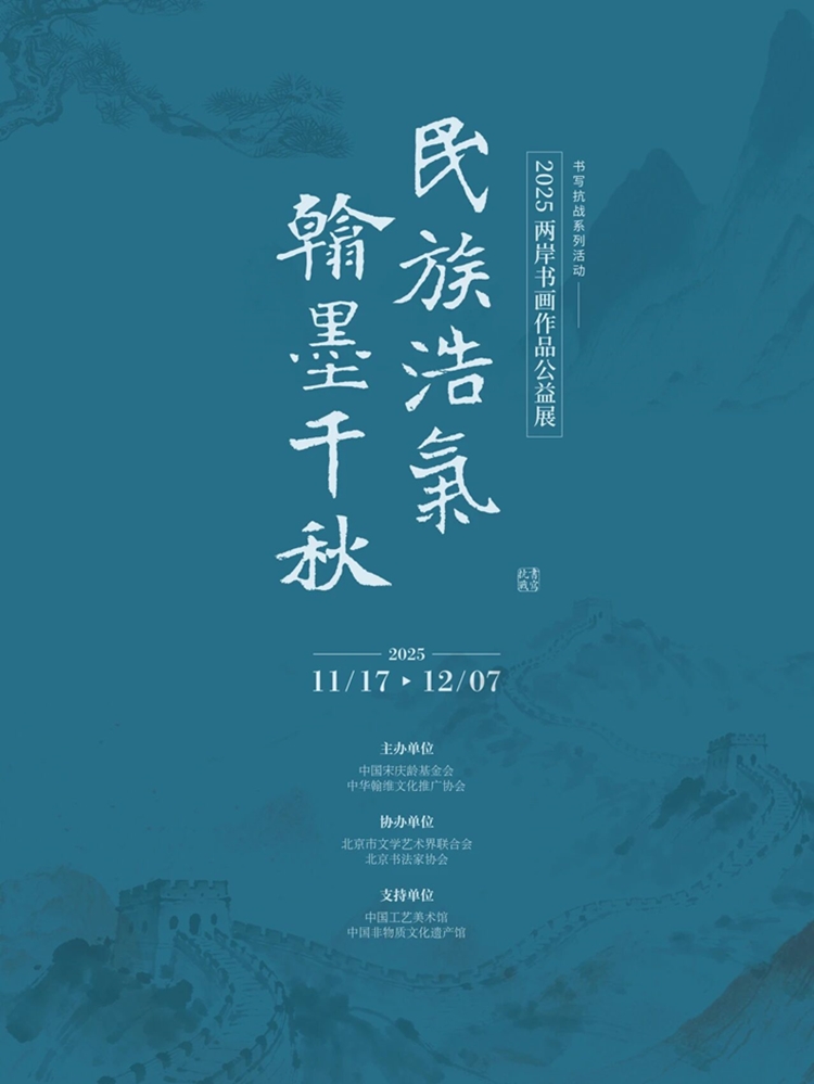 为纪念中国人民抗日战争暨世界反法西斯战争胜利80周年、台湾光复80周年,两岸机构携手举办“书写抗战系列活动:民族浩气 翰墨千秋——2025两岸书画作品公益展”。此次展览展出大陆61位、台湾39位艺术家的百幅书画作品,以千秋传承的翰墨气象,重温全民族抗战和台湾反抗日本殖民统治时期众多仁人志士激励人心的名言警句,反映了两岸仁人志士勇毅坚韧、团结御侮的民族气节,以身报国的赤子之心以及对故土家乡的深情眷恋和真挚深沉的家国情怀,缅怀为争取民族独立和解放作出贡献的先辈先贤,发出自强不息、振兴中华的时代强音。