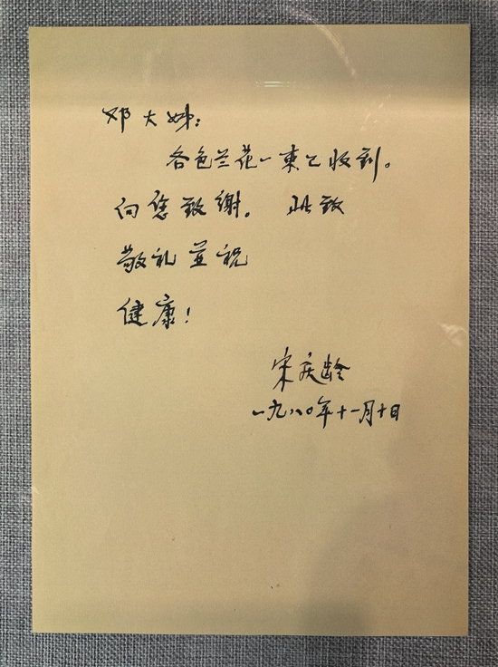 这是一封宋庆龄写给邓大姊的致谢信,感谢邓颖超赠送各色兰花组成的美丽花束,时间为1980年11月10日。两天后,宋庆龄在北京后海寓所,有生之年最后一次为孙中山庆生。她会将这束鲜花敬献给孙中山,放置于小客厅东墙孙中山照片前的长条几案之上。