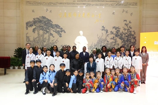 海棠树下,盖塔・查波一行观看了中莫两国青少年带来的文艺表演。北京音协童声合唱团演唱《小先生歌》和非洲歌曲《Siyahamba》,莫桑比克在华留学生演唱传统民歌《Xikongolotana》。盖塔・查波与青少年亲切互动,载歌载舞,现场氛围热烈融洽。