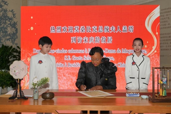 参观结束时,盖塔·查波在留言簿上欣然题词:宋庆龄故居是一座承载着深厚历史底蕴的纪念场所。此次参观,让我更加全面地了解了宋庆龄光辉而伟大的一生,深切感受到她为中国国家和民族作出的卓越贡献,以及她对少年儿童的深切关怀与爱护。在这里,她曾亲切会见了众多中外友人,为增进国际友谊搭建了重要桥梁。作为莫桑比克第一夫人,我对宋庆龄女士毕生的奉献与崇高风范深感敬佩,也十分荣幸能有机会到访参观。