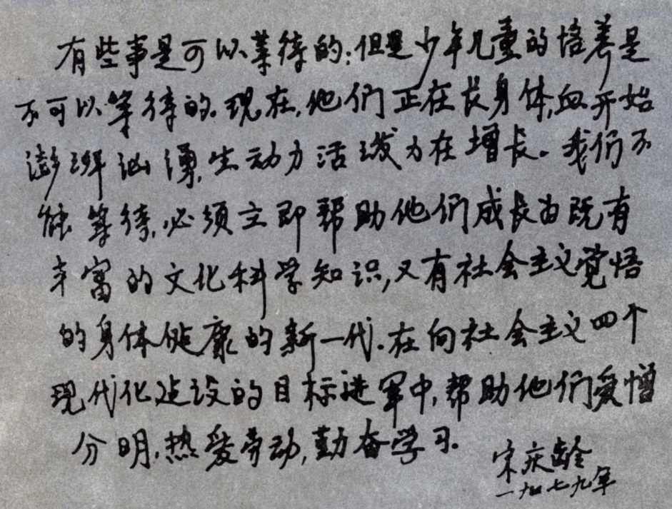 1979年“六一”国际儿童节,她专门给《中国青年报》题词,强调:“有些事是可以等待的,但是少年儿童的培养是不可以等待的”,勉励孩子们要做:“既有丰富的文化科学知识,又有社会主义觉悟的身体健康的新一代。”