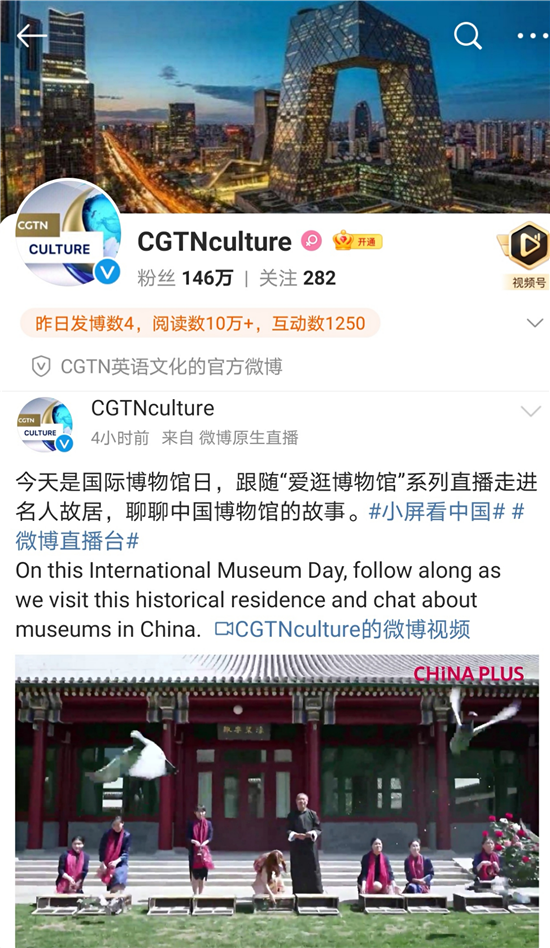 5月14日上午,故居在中国国际电视台(英文简称CGTN,中文别称中国环球电视网)推出英文直播,在拥有百万粉丝的微博直播平台上,CGTN英语文化主持人Caroline Wu(吴一帆)和工作人员一起,用英文向海内外网友讲述宋庆龄的故事,同时通过Facebook和YouTube账号面向海外观众直播。国际博物馆日当天,在宋庆龄故居青翠欲滴的大草坪上,工作人员放飞和平鸽,在鸽哨中再次开始深度介绍宋庆龄故居,同时介绍中国的博物馆,让观众了解中国历史,品鉴中国文化。