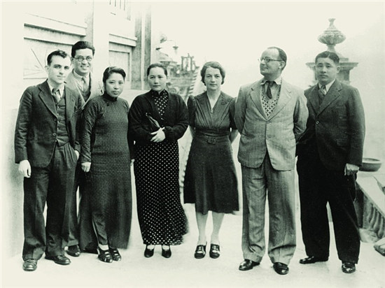 宋庆龄与“保盟”部分委员的合影,从右至左为廖承志、弗朗士、克拉克、 宋庆龄、廖梦醒、邓文钊、爱泼斯坦