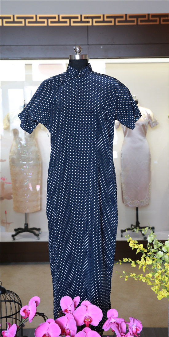 在北京宋庆龄故居的生平展厅中,有一个约2米高的立式恒温玻璃展柜,展示着一件深蓝色真丝旗袍。深底上印着素雅的白色波点花纹,裙摆在展室盈盈灯光的烘托映衬下自然地垂落,十分飘逸。它是宋庆龄“保盟”工作时期穿过的旗袍复制件,被评为珍贵的国家一级文物。