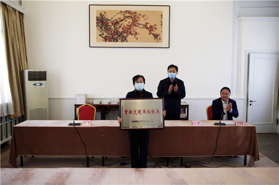 2022年3月23日上午,会党组书记杭元祥、副主席于群、机关党委常务副书记衣学磊来到宋庆龄故居为故居管理中心颁发“首都文明单位(标兵)”奖牌。