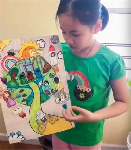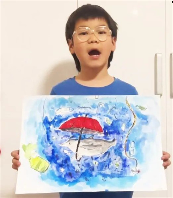 海外分会场的小朋友在介绍自己的作品“保护地球”。