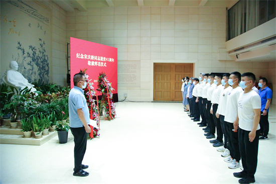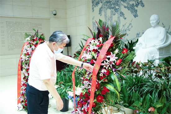 李安晋受中国宋庆龄基金会的委托,同时代表宋庆龄故居管理中心向宋庆龄同志汉白玉雕像敬献花篮,仔细整理花篮上的缎带。全体人员向宋庆龄同志雕像三鞠躬,表达深切缅怀和永恒纪念。