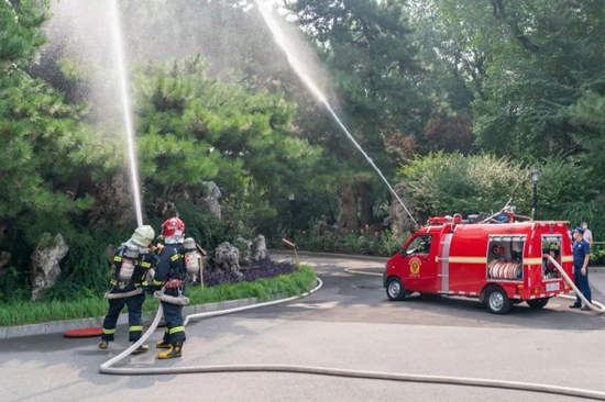 随着联合演练的火灾报警器响起,正在宋庆龄故居参加“时代小先生”夏令营的营员们在工作人员和志愿者的引导下,迅速有序疏散到安全地域。故居员工按照应急预案,分指挥组、疏导组、警戒封控组、文物抢救组和医疗救护组,各司其职到达指定岗位展开救援处置工作。驻地武警第一时间立即启动微型消防站,接通消防栓进行灭火。西城消防支队两台救援水炮车同时向着火点喷射,火势被控制熄灭。联合演练活动时长约40分钟,通过逃生疏散演练、消防知识讲解、演示消防器材和灭火技能实操等形式,呈现了一堂生动的消防安全教育课。