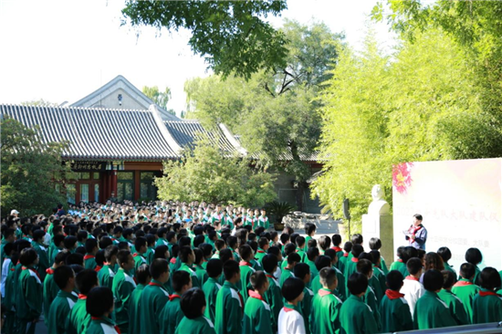 金秋九月,美景怡人。9月20日,北京市第十三中学分校500名初二新生来到宋庆龄故居,在绿竹掩映、古朴肃穆的故居东广场上隆重举行少先队建队仪式,并参加爱国主义教育主题社会大课堂活动。中国宋庆龄基金会副秘书长、宋庆龄故居管理中心主任李安晋出席,与十三分副校长杨晓蓓一起为学生代表颁奖。