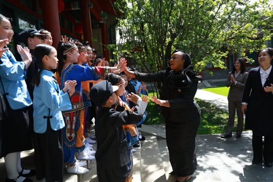 海棠树下,盖塔・查波一行观看了中莫两国青少年带来的文艺表演。北京音协童声合唱团演唱《小先生歌》和非洲歌曲《Siyahamba》,莫桑比克在华留学生演唱传统民歌《Xikongolotana》。盖塔・查波与青少年亲切互动,载歌载舞,现场氛围热烈融洽。